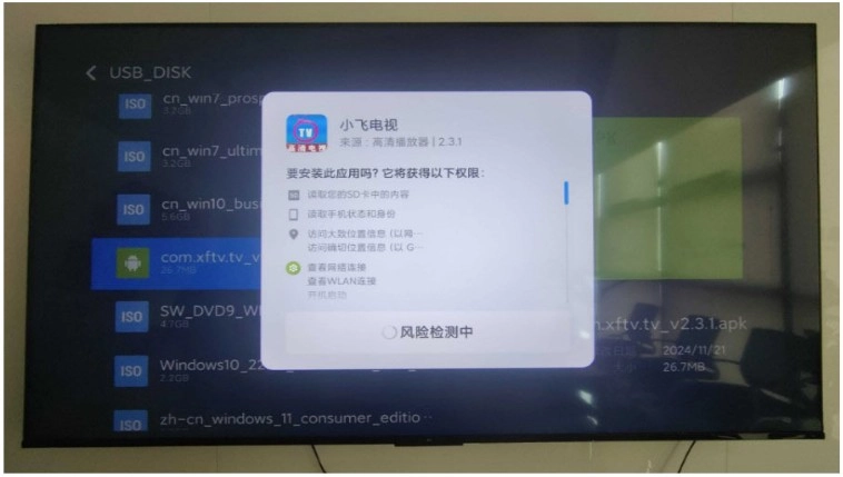 2、把存有优质小飞电视安装包的U盘,插入电视的USB接口,此时电视会提示检测到新的USB设备并可打开。