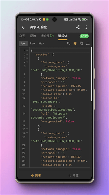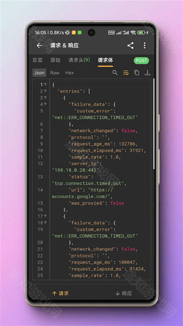 HttpCanary能够让用户浏览某个网络请求的整体概况,涵盖URL、HTTP协议、HTTP方法、响应码、服务器Host、服务器IP与端口、Content-Type、Keep-Alive、时间信息以及数据大小信息等内容。