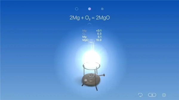 1、第一步要把各类设备按照图示摆放妥当。此处选用的是烧杯,但正确的应该选择陶瓷坩埚,在此展示烧杯破裂的错误示范情景(软件顶部设有三个小圆点,第一个代表实验器材,第二个代表各种化学物质,第三个代表火柴和温度计 )