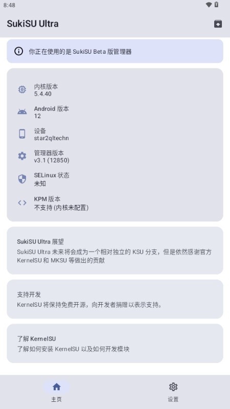 接着,在你的设备上安装SukiSU Ultra管理器并将其打开。要是它显示“不支持”,这表明你的设备没有开箱即用且支持的boot image ;不过,你能够自行编译内核并集成SukiSU Ultra,从而得以使用它。