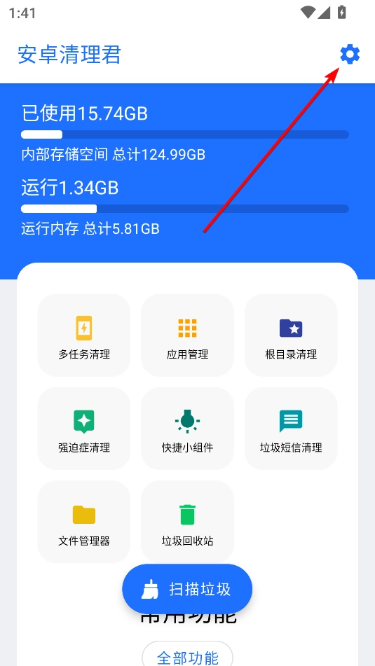 1. 开启安卓清理君,轻点右上角的齿轮图标。