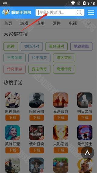 1、打开蜻蜓网软件后,点击右上角。在游戏、软件、硬件、电视这四个大分类里,挑选各自的子分类。