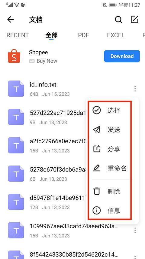 3、进入文件界面后,能看到上方已把手机里的所有文件划分成音乐、应用、视频、图片、文档等类别。选中相应文件,即可执行选择、发送、分享、重命名、删除、查看详情等操作。