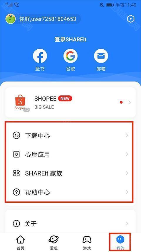 7、在“我的”界面,设有中心、心愿应用、SHAREit家族以及帮助中心等选项。用户能够依据自身需求进行选择使用,比如查看文件或者查看帮助内容。以上便是茄子快传的使用方法。