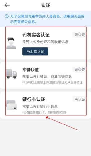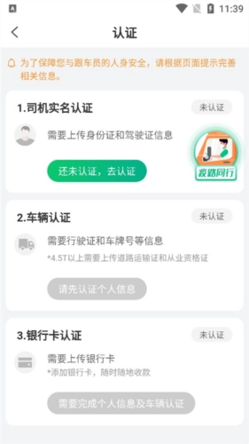 2、进入认证界面之后,可以看到有三个信息需要你认证,但这边最重要的就是【司机实名认证】,所以这里需要先点击【马上去认证】;