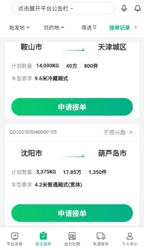 3、还可以自主寻找比较适合自己的订单,上面会有出发地、目的地等等选项可以筛选,找到了之后点击自主接单可以进行自由接单;