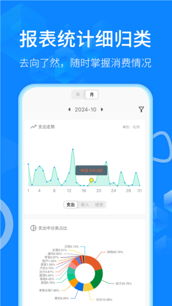 支持对1级分类与2级分类进行各类报表统计,让您能轻松明晰资金去向,进而及时调整消费习惯。