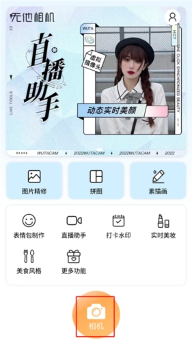 1、打开软件,映入眼帘的是极为丰富的功能,像图片精修、拼图、素描画、打卡水印等。随后,我们点击拍照。
