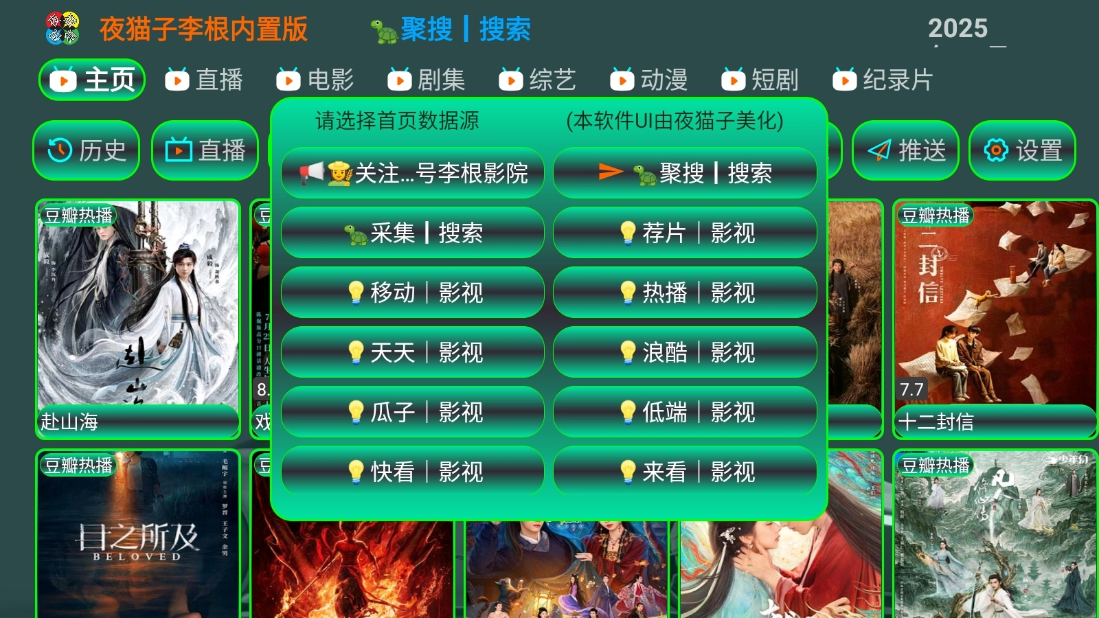 2. 轻点左上角的主页按钮,映入眼帘的是影视源相关内容,在此界面能够自由切换不同的数据源。