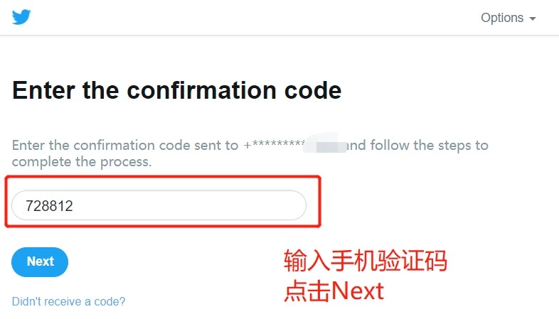 4、此时,我们会收到来自twitter的一条验证短信,将该验证短信的内容填写至验证输入框,接着点击下一步,至此账号便注册成功了。