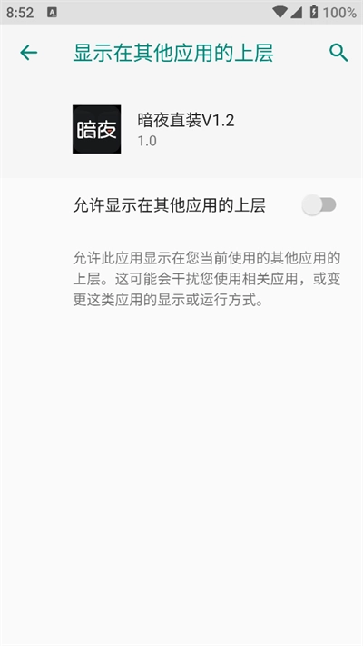 2. 先安装暗夜直装V1.2,安装完成后打开该应用,接着点击开启悬浮窗权限。