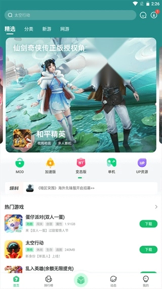 2、若使用的软件版本在3.8及以上,可直接在首页点击mod栏目开启游戏,此处的MOD指的就是修改版游戏。