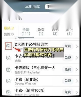 在曲库内寻得想要演奏的歌曲后,能够点击歌曲左侧的加号,把歌曲添加至播放列表。