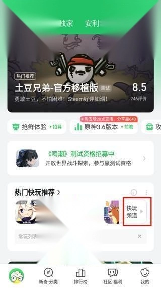 1. 进入快玩频道的方法是,点击快爆首页“最近常玩”栏目右侧的快玩频道。