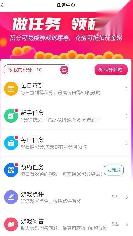 3、完成游戏平台所发布的任务,即可领取积分。领取的积分能够用来兑换游戏优惠券,在充值时还可抵扣现金。