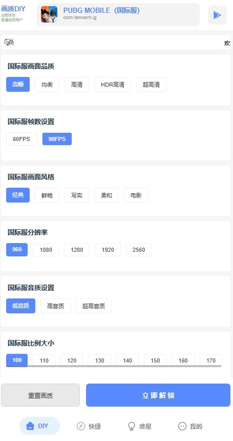 3、轻点屏幕最下方的快捷界面,接着点击画质右侧的解锁按钮,就能迅速完成画质修改。