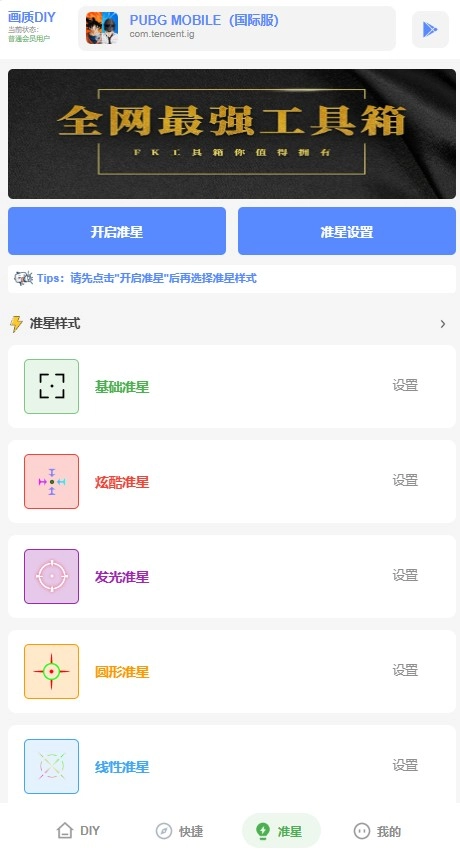 4、点击位于最下方的准星界面,此时要先点击左上角的“开启准星”选项,之后再点击准星设置,从而对准星的颜色、形状等进行修改。