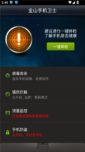 金山手机卫士是由金山网络有限公司所开发的一款手机杀毒软件,它以保障手机安全为核心,具备流量监控、恶意扣费拦截、防垃圾短信、防骚扰电话、风险软件扫描以及私密空间等一系列实用的安全功能。金山手机卫士依托金山在安全性方面的知名品牌专业能力,在手机防护领域为用户提供最为便捷、最为实用的安全保障。