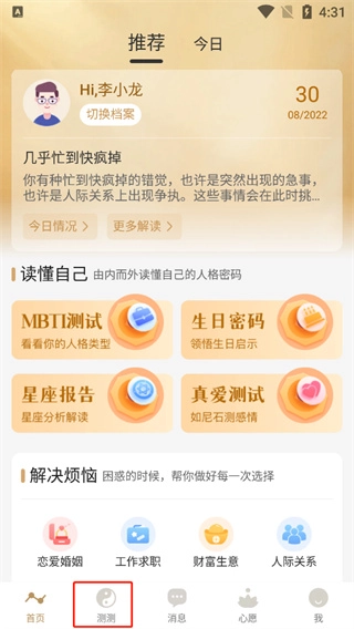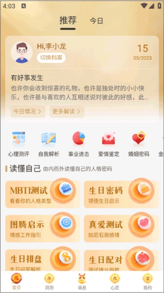 1. 打开已在本站安装完成的应用,于首页便能就人格、生日、图腾、真爱测试、生日排盘、生日配对等展开咨询。