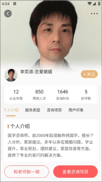 5、随后,在老师个人界面,能够选择并点击“查看咨询项目”这一选项,以此进一步了解收费情况。