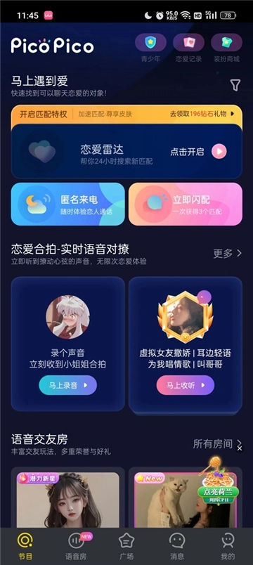 平台设有恋爱合拍功能,专属声控福利频道,让你尽情畅谈爱情与梦想。