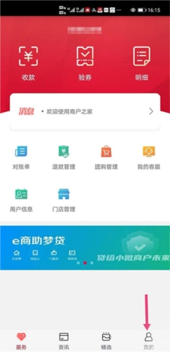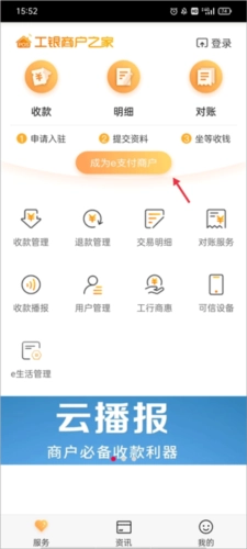 1. 开启工银商户之家后,默认会进入主界面中的【服务】界面,在此界面点击上方的“成为e支付商户”选项。