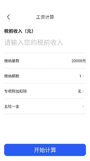 3、填入五险一金、缴纳期数、税前收入等各项数值,点击“开始计算”。