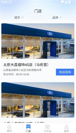 3、进入门店界面,便能瞧见分布于全国各地的汽车销售网点,这里提供电话咨询与路线导航服务。