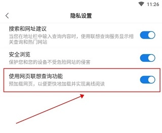 5、于“隐私设置”窗口内,挑选“使用网页联想查询功能”这一栏目。