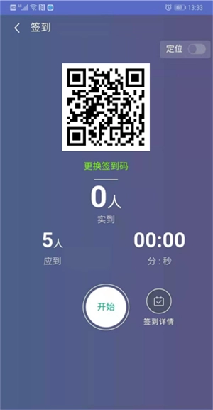 4、在定位页面点击“开始”,就能开启签到功能。在签到过程里,随时点击“更换签到码”,便可实现不同时间的签到码更换,在一定程度上避免签到作弊情况的出现。