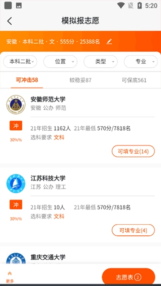 2、点击“模拟智能填报”,学生能够依据自身需求,选择相应的地理位置、学院类型以及各个专业等。