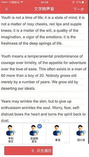 3、输入以下文字,便可对语速进行调整、更换播音员,若感到满意,点击“下一步”即可。