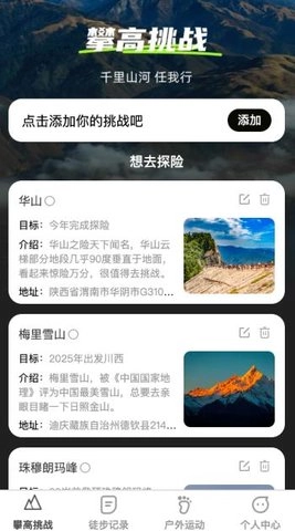 3、聚焦于健康运动领域的应用,具备攀岩挑战、徒步记录以及户外运动介绍等功能。