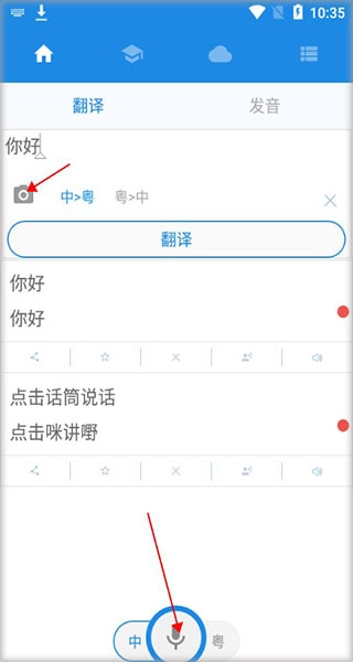 2、接着点击翻译后在下方所显示的已翻译好的话筒,再点击喇叭就能播放。