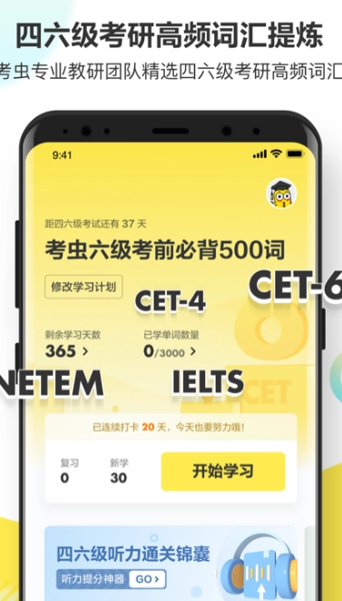考虫单词的词书涵盖英语四六级、考研英语、雅思等考试。其中所有词汇都源自历年真题,并以真题例句辅助记忆,帮助考生实现高效备考。