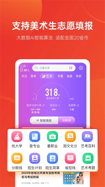 优志愿特别推荐给即将步入高考战场的高三学子们。它能助力考生精准剖析,究竟考多少分能考上何种高校与专业,并给出最为优化的建议。这款软件会依据今年的招生计划,结合往年院校分数线、专业分数线、最低录取分数线以及滑档几率等诸多因素,精准推算出今年的大致分数线,进而为考生提供全方位建议,涵盖专业介绍、就业前景、未来发展趋势以及薪酬分析等内容,帮助学生判断心仪的院校专业是否契合自身的理想要求。优志愿作为志愿填报领域中最权威、最专业、最全面的平台,必定能助力你成功被心仪的专业院校录取!