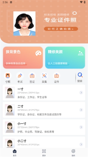 免费电子证件照最新版,这是一款具备照片美化功能的软件,功能十分强大。无论是一寸、二寸等常用尺寸的照片,还是结婚证照、学籍证件照、考试证件照等,数百种尺寸需求它都能满足。不仅如此,软件还支持自定义规格大小与分辨率。有相关需求的朋友,快来体验一番吧。
