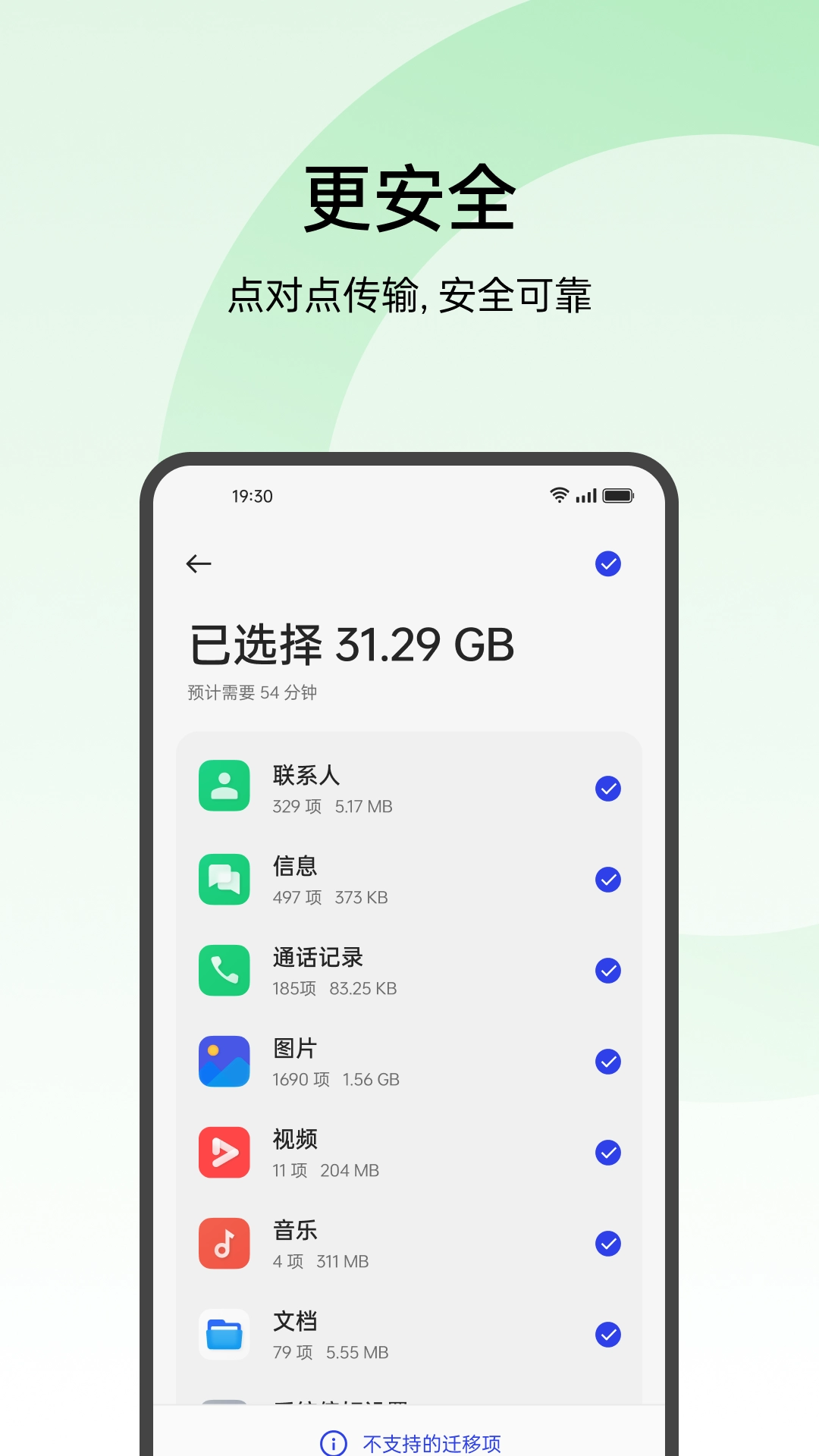 2、支持迁移联系人、短信、照片、视频、音乐、文档、已安装的应用等多项数据