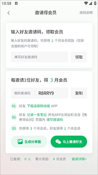 老用户可经由「我的」→「邀请得会员」→「马上邀请」,生成唯一邀请码、宣发海报以及文案。