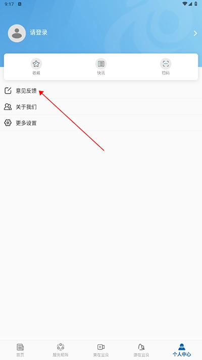 2、在个人中心界面内找到并点击“意见反馈”;