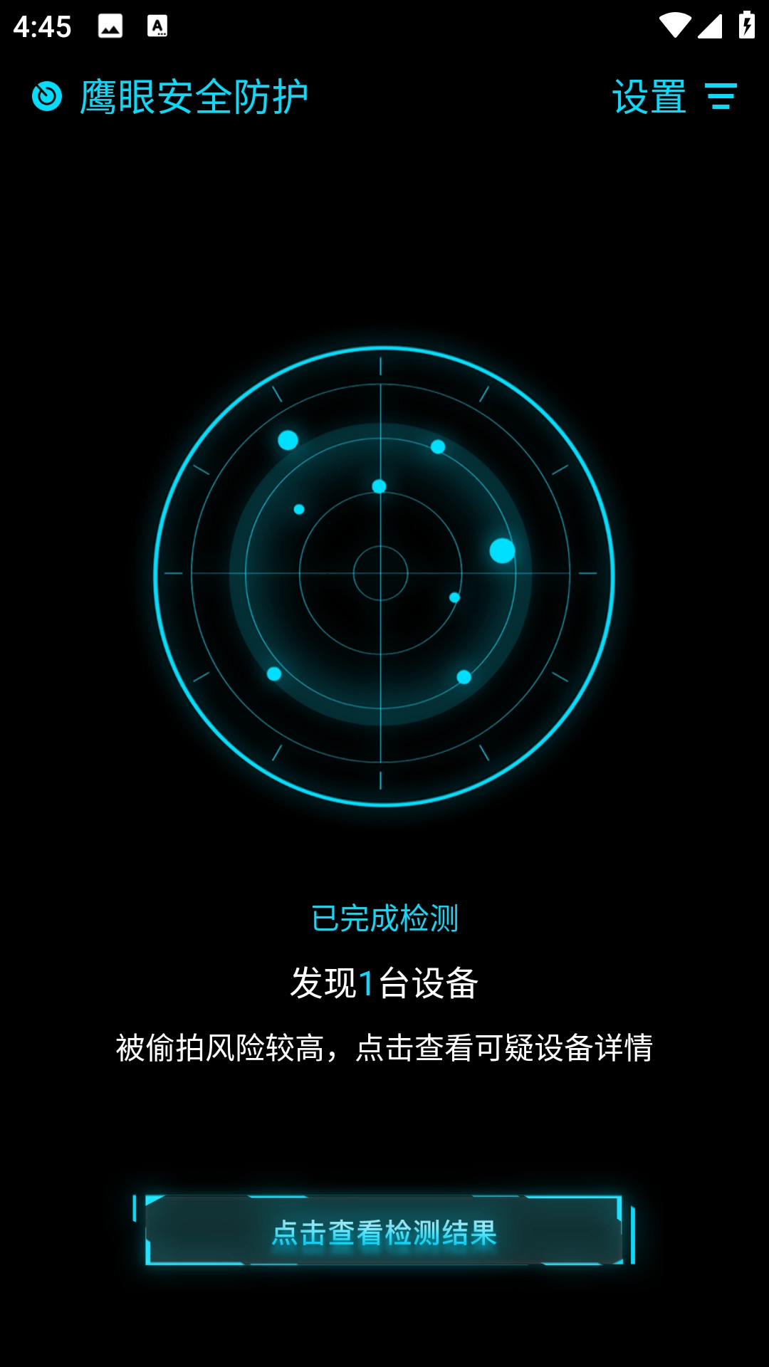 3、红点检测:鹰眼安全防护内,可在指导下使用红点检测查找隐藏摄像头。鹰眼安全防护多重反偷拍功能,有效防止隐私外泄,是您外出旅行、租房住店的必备神器。