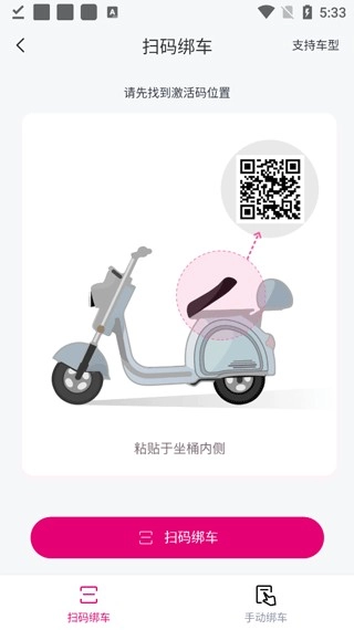 4、若选择扫码绑定,请注意二维码位于坐桶内侧;此外,也能够通过手动输入激活码或车架号来进行绑定。