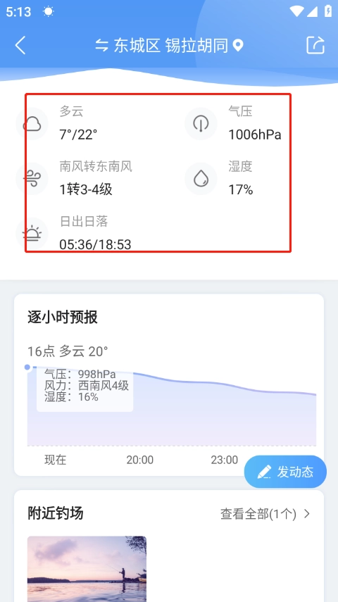 3、继续往下滑动页面,能够看到气压数值为1006hPa,湿度为17% 。综合这些参数来判断,在该地区的这个时间段,钓鱼上钩的几率相对较低。另外,大家要记得将定位调整到自己实际钓鱼的区域哦。