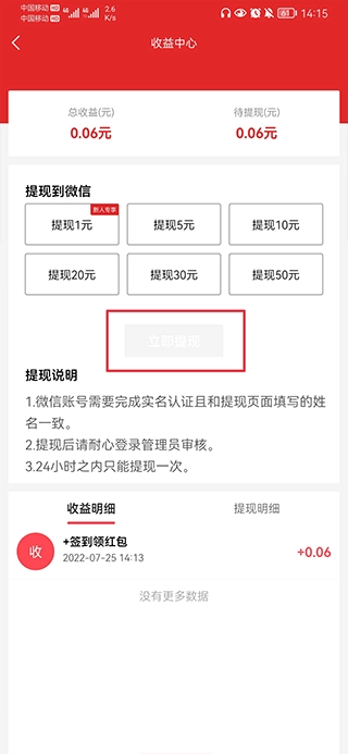 三、当金额达到提现标准时,就能把赚取的红包提现至微信。
