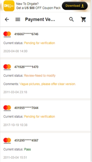 2. 轻点“付款验证”,便能看到待验证的信用卡以及验证结果: