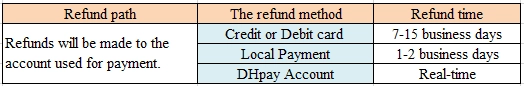 当前,DHpay账户不受理任何现金业务。我们仅能把您的退货运费(以奖励形式退回)或其他特殊补偿(同样以奖励形式)退至DHpay账户。所有退款均会返还至原账户。