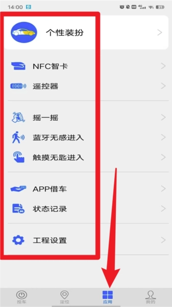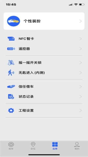 4. 切换到「应用」页签,点击个性装扮、NFC 智卡、遥控器等模块,自定义车辆控制方式。