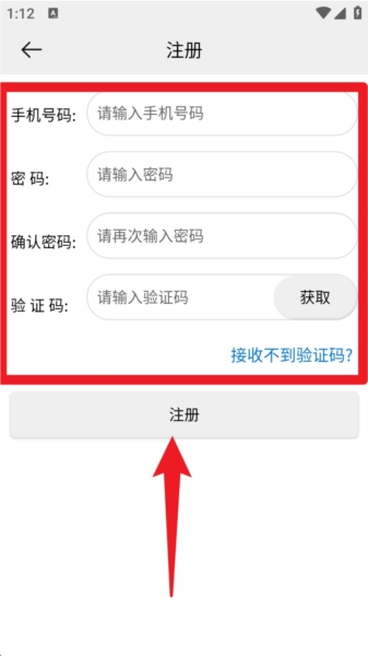 1. 首次打开 App 后,进入注册页面,填写手机号、密码、验证码并点击注册按钮,即可完成账号创建流程。