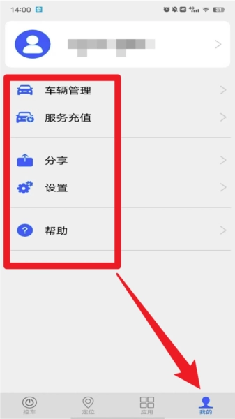 3. 在底部点击「我的」标签,可以查看车辆管理、服务充值、设置、帮助等个人功能项。