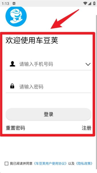 2. 注册成功后返回登录页,输入手机号与密码,勾选协议后点击登录,进入车豆荚主界面。